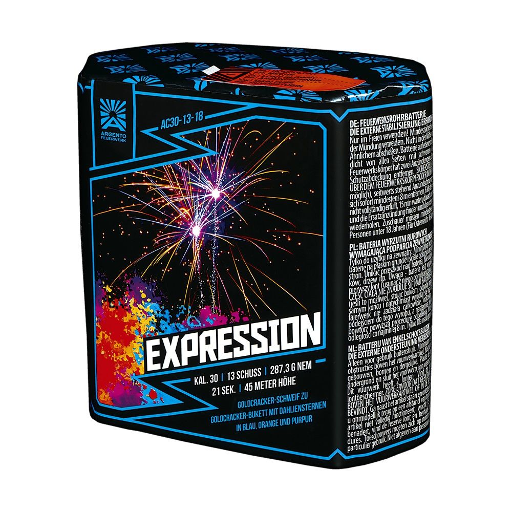 ist die "Expression" mit 287 g Nettoexplosivmasse, 13 Schuss, im Kaliber 30 mm. Ein I-Shape Cake der zum