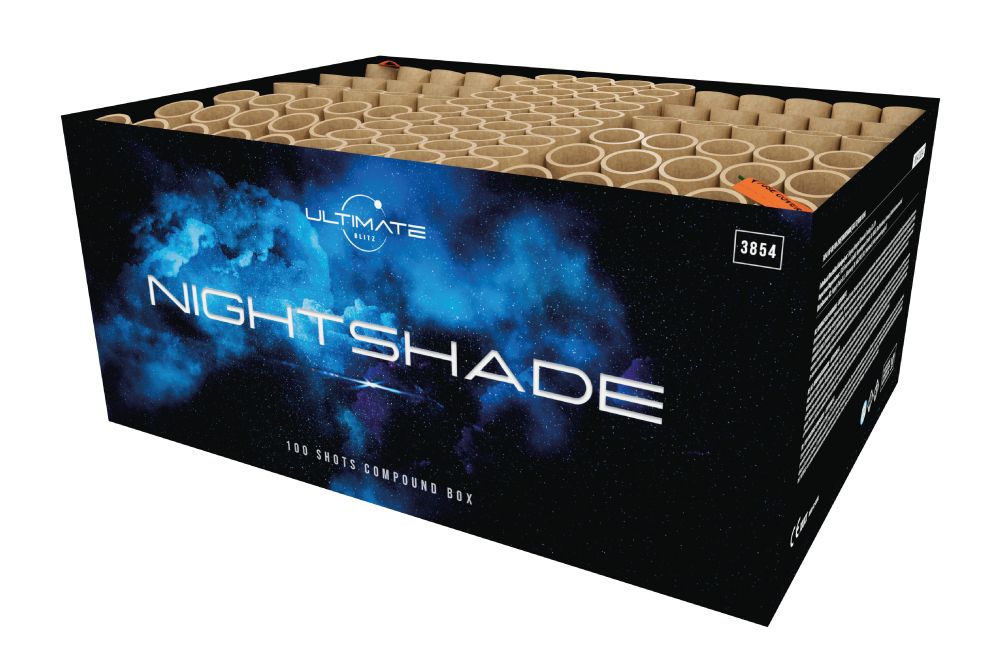 Nightshade" mit 1200 g Satzmenge.Verschiedene Goldeffekte mit bunten Sternen und Blinkern sowie