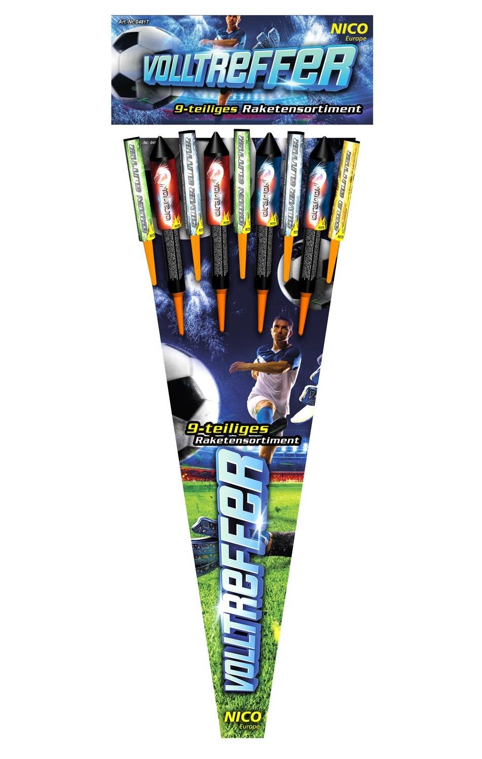 Das Feuerwerks-Raketen-Set "Volltreffer" ist ein 9 teiliges gemischtes Raketenset von Nico Feuerwerk